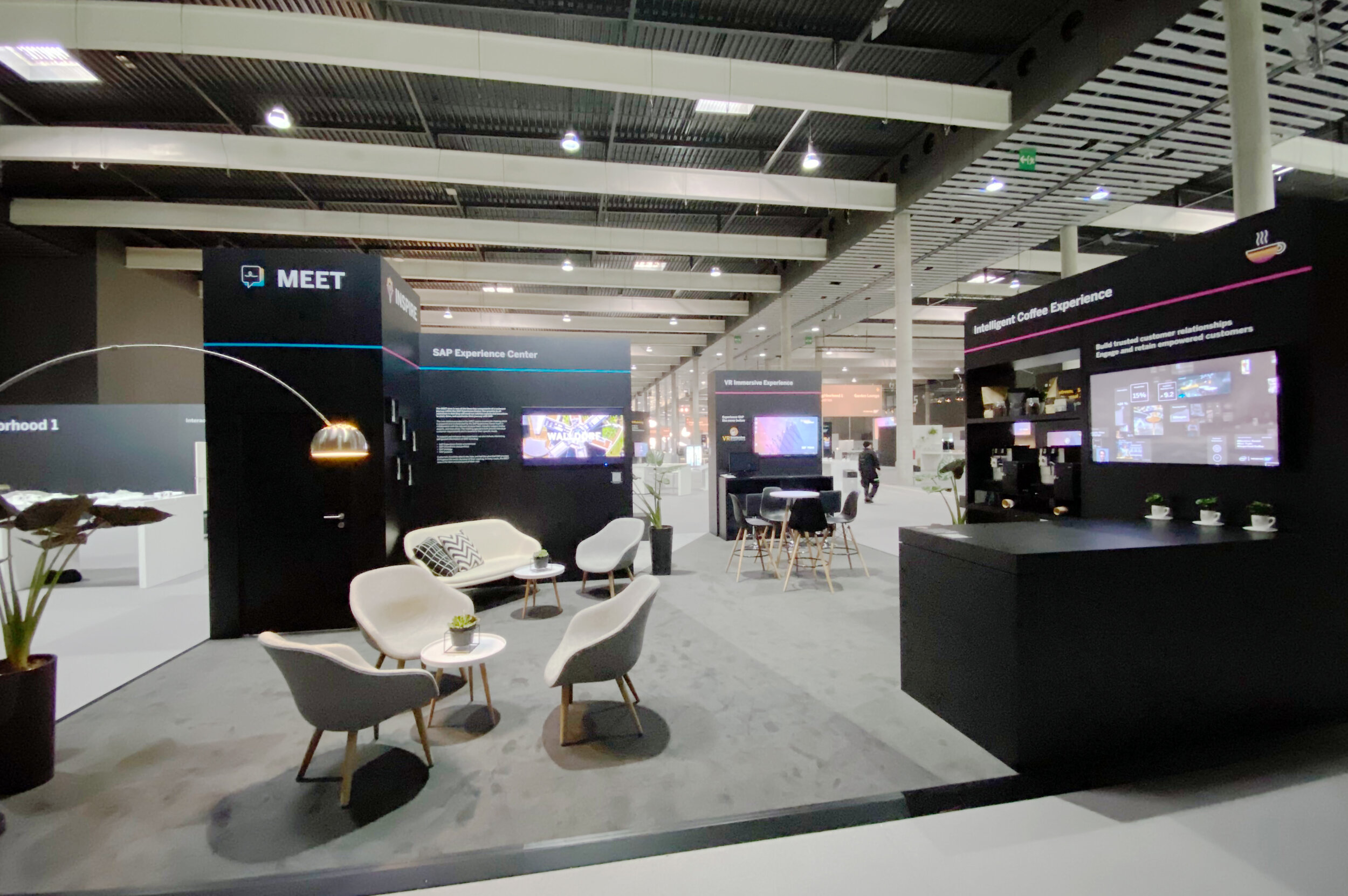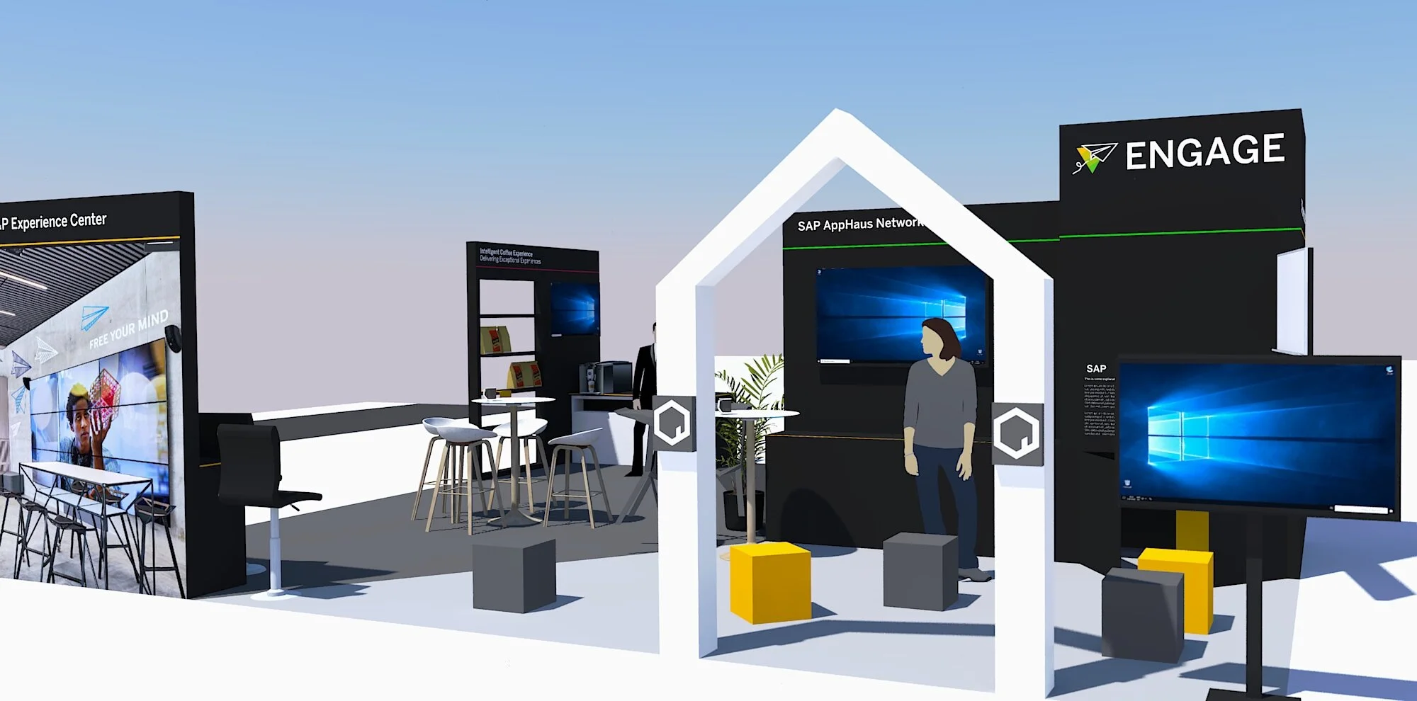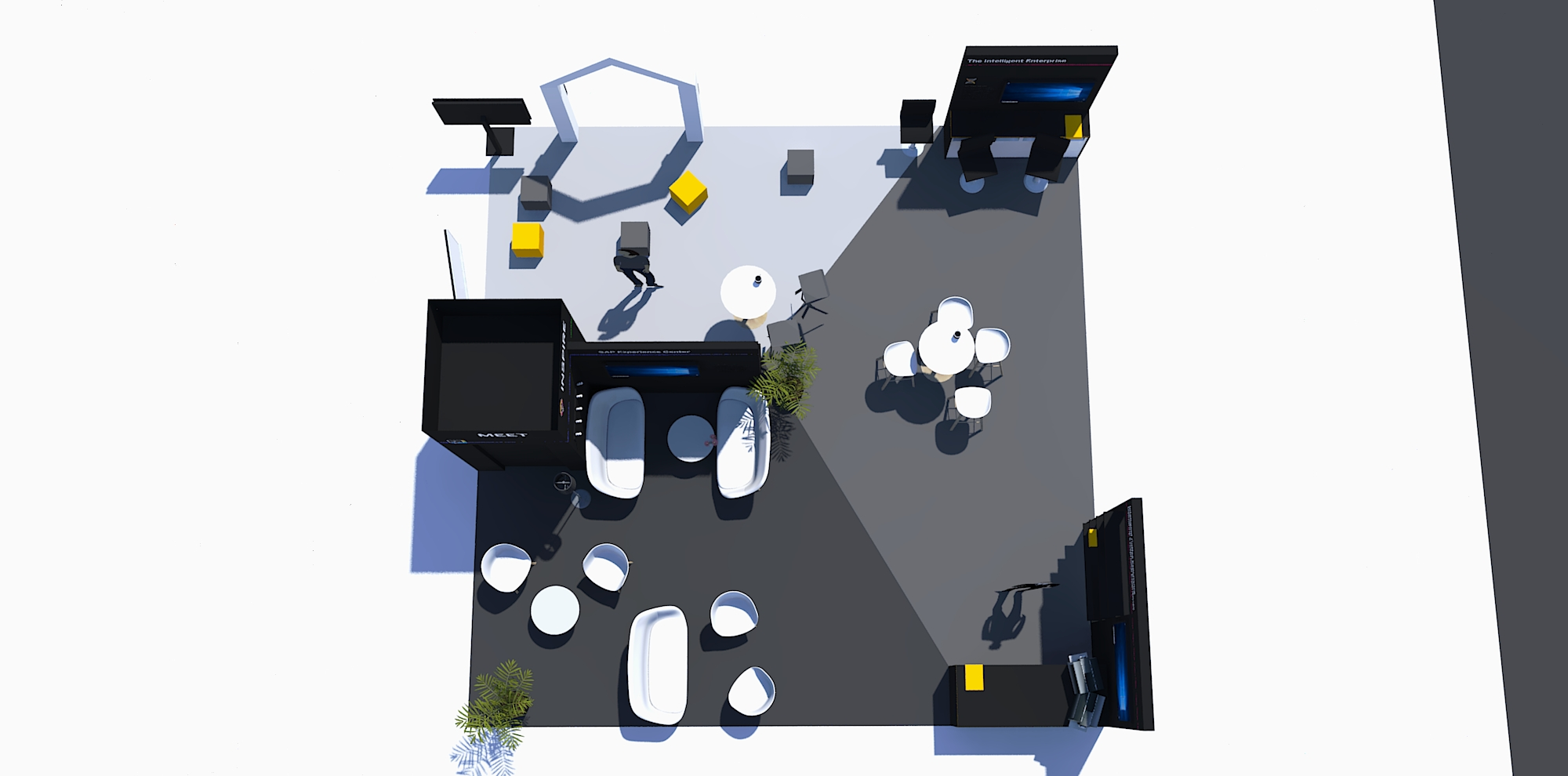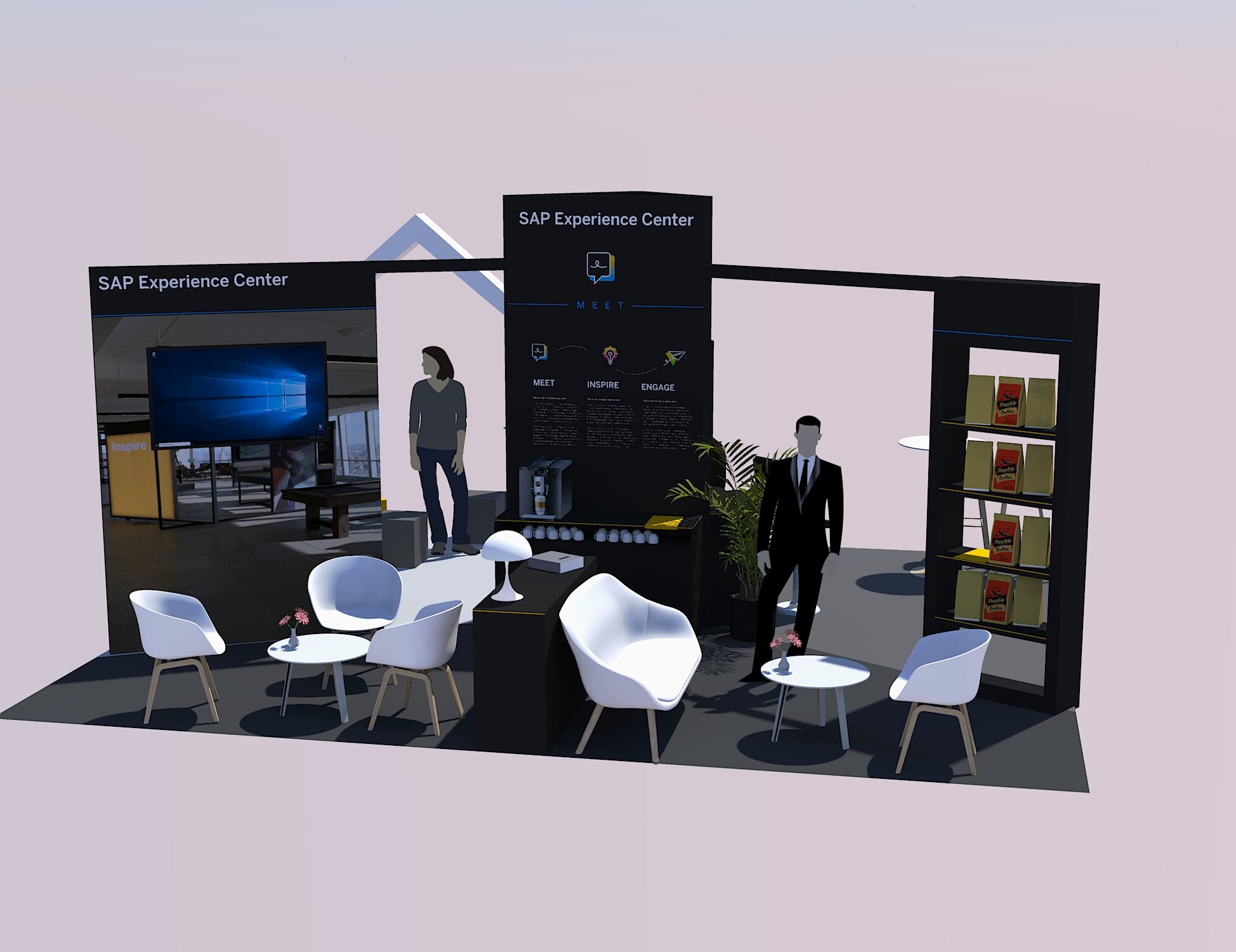 At trade shows and events, we need lightweight, cost- and space-efficient elements, that transport the feeling of visiting an SAP Experience Center without hindering the visitor flow across the booth area. I developed a concept that exemplifies our three distinct areas “Meet”, “Inspire”, and “Engage” with context-specific furniture and elements that can be found in the real centers. A central tower serves as storage for staff items and AV equipment, as well as a beacon to attract visitors.