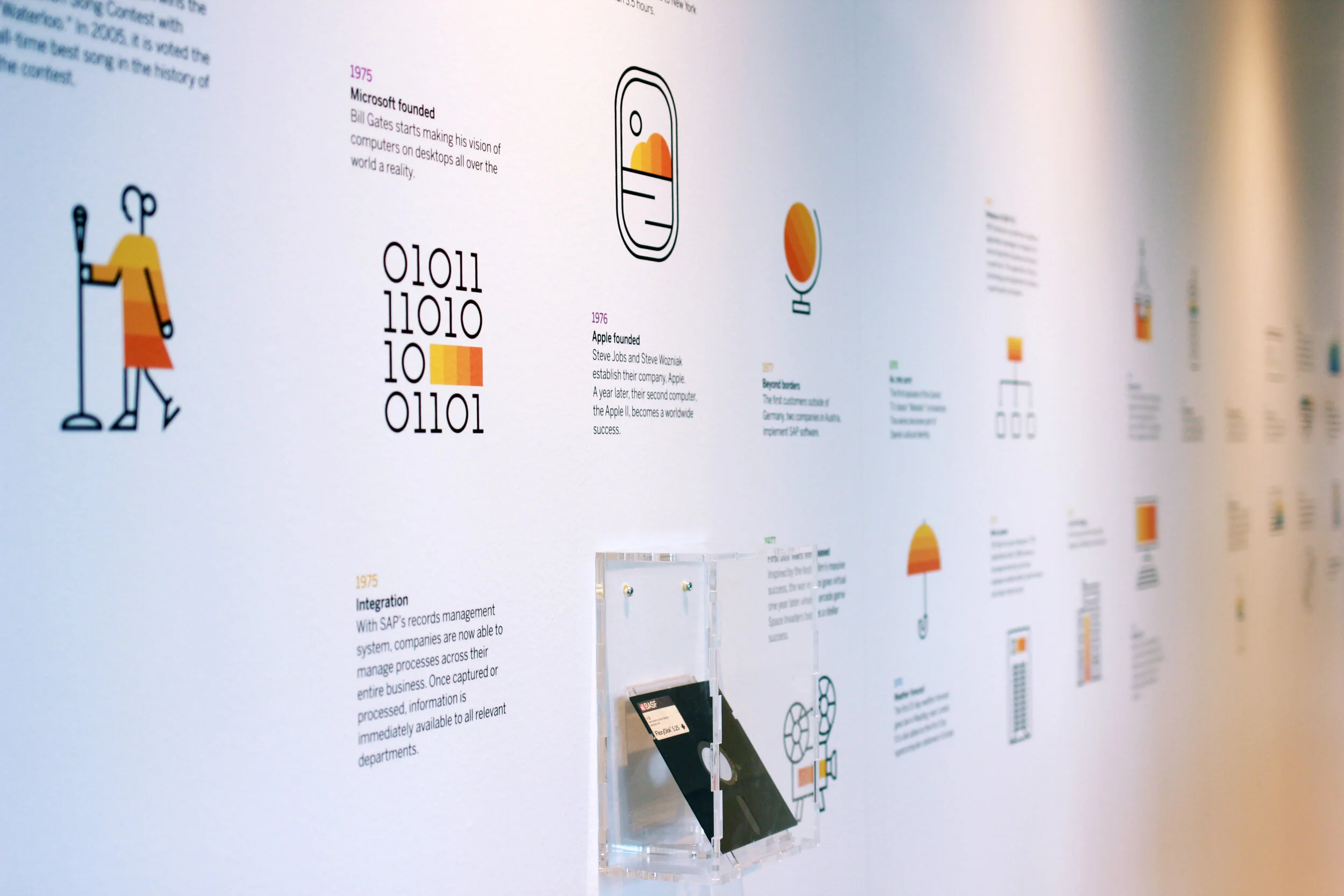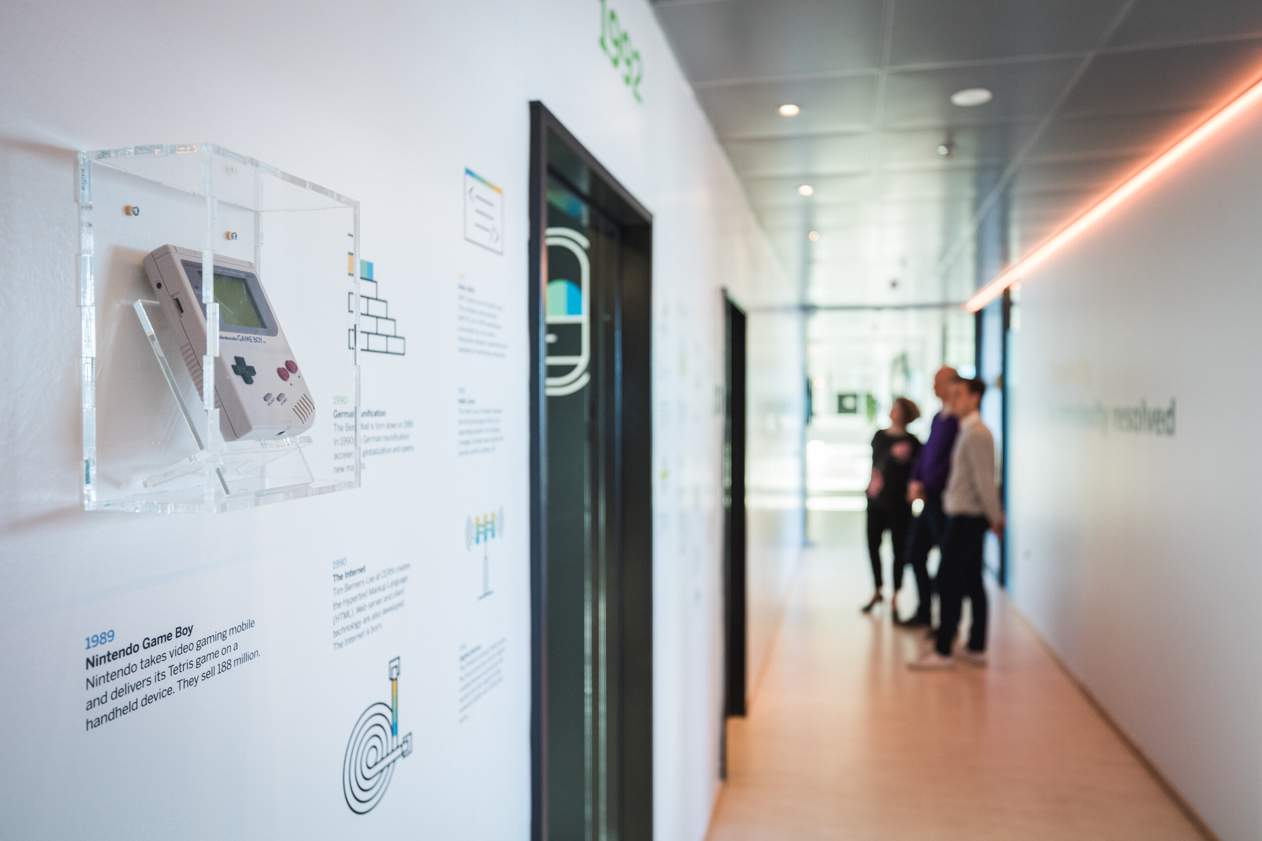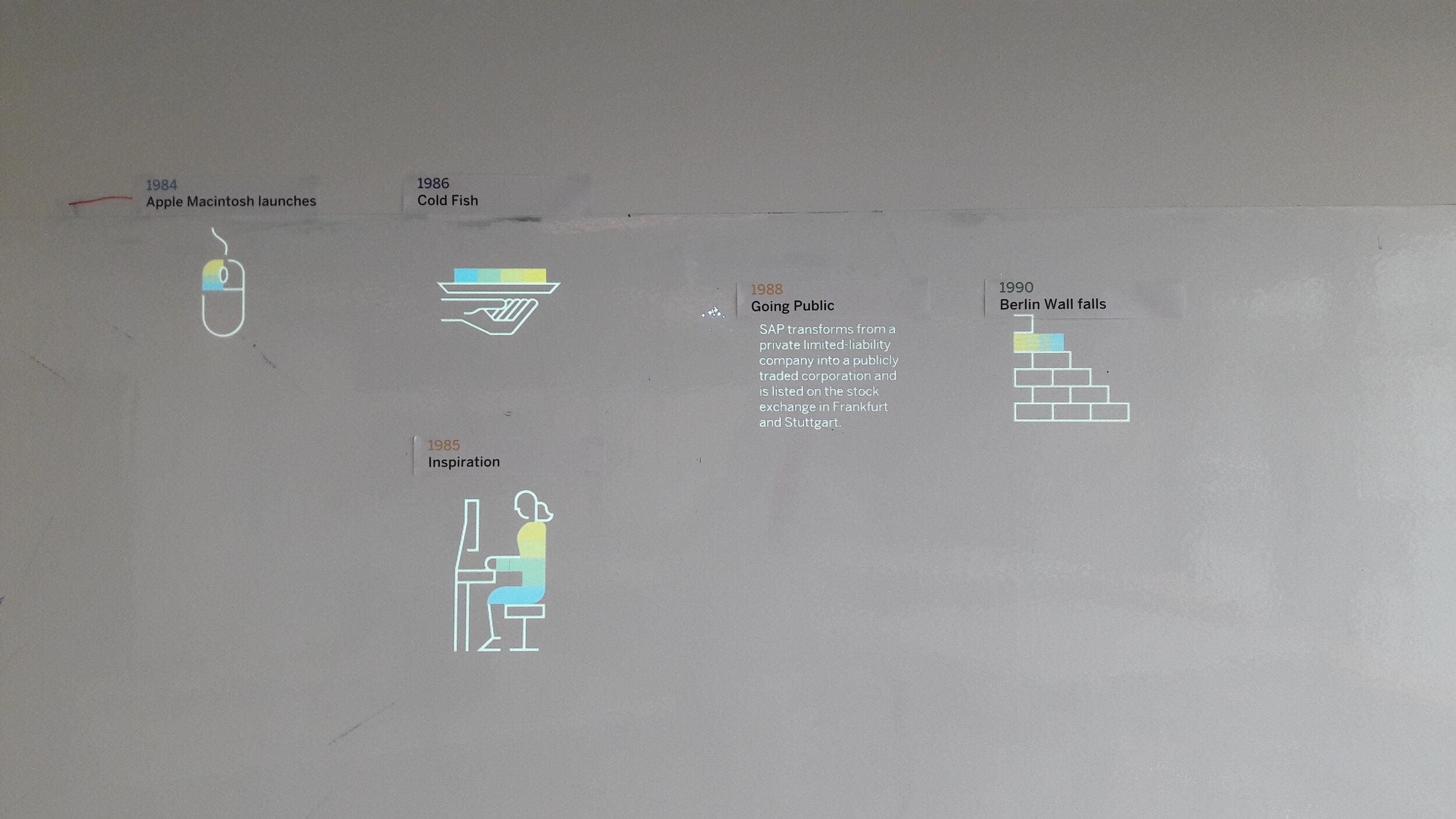 I designed the SAP History Wall, which is a wallpaper with major tech, global, and SAP events from 1972 (the founding year of SAP) until the present. The first, 17m long wall was set up in a narrow hallway in the Copenhagen office. From there it spread to our centers in South Africa, France, Germany, and Brazil - with local adoptions. Besides global events like the launch of the first space shuttle (which had less than 1MB of memory), local trivia such as Denmark’s world cup win in 1992 create entertaining icebreakers for visitor groups.