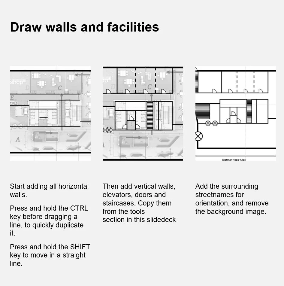 Moreover, I harmonized and digitized floorplans and maps that can be reused in other documents and websites. For that, I reached legal agreements with mapping providers, created a simplified map style, a tool to easily find centers, PowerPoint templates to add relevant street names and create floorplans, as well as a series of tutorial videos and guides.