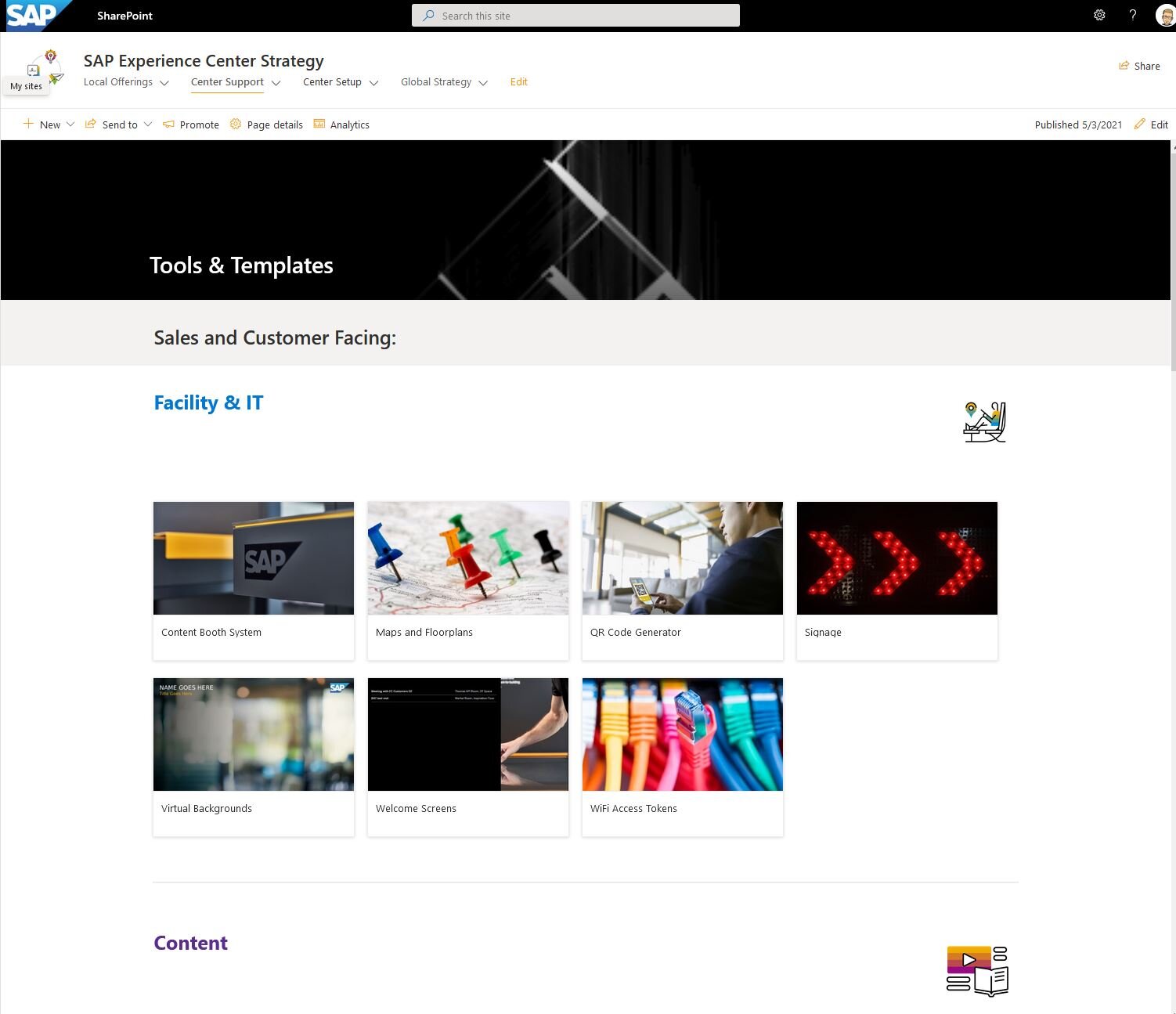 A major milestone on the harmonization journey was my creation of internal and external websites that serve as central hubs for the global center family and all our clients. After developing a design together with brand and IT teams, I onboarded our 20 focus locations. Our internal SharePoint sites provide tools & templates, guidelines, and contacts for more than 100 customer-facing locations. They help to streamline transformations and operations. By now, it has become one of the largest knowledge collections within SAP.